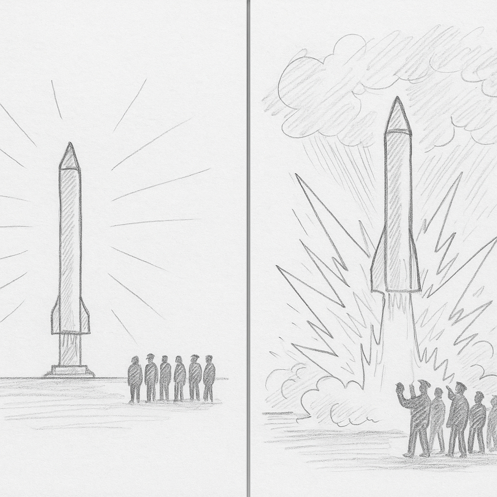 Ignition and release. A violent burst tears the silence. Bright, forceful, upward thrust erupts from the structure. Shockwaves ripple through air and ground. Smoke, debris, and fumes expand. People react instantly—startled, shielding, some shouting. The event defines itself as demonstration: engineered, staged, dramatic.