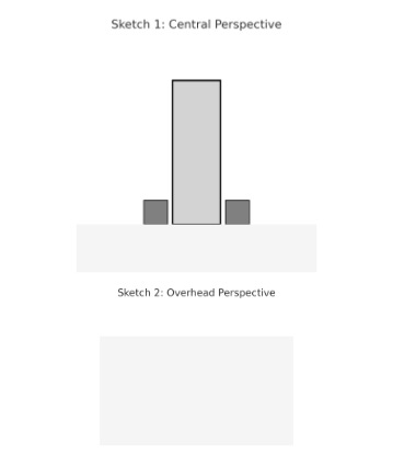 Central Tower: large, rectangular block, positioned in the center of a paved expanse