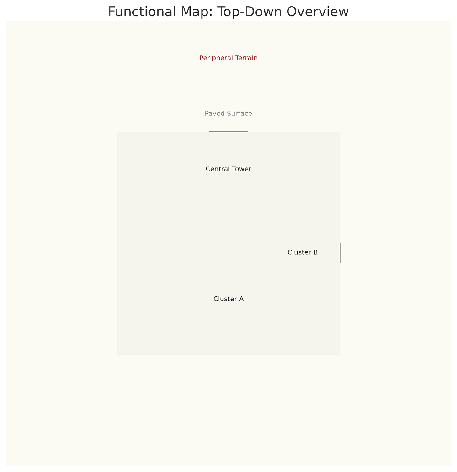 Paved Surface: uniform beige-gray plane surrounding the tower and clusters