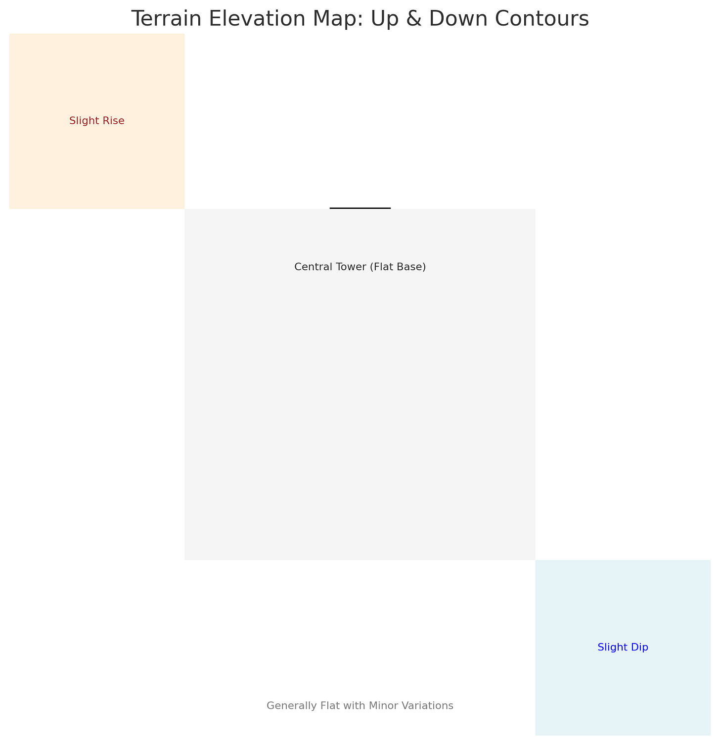 SE corner (bottom-right): gentle dip — a slight depression or slope.