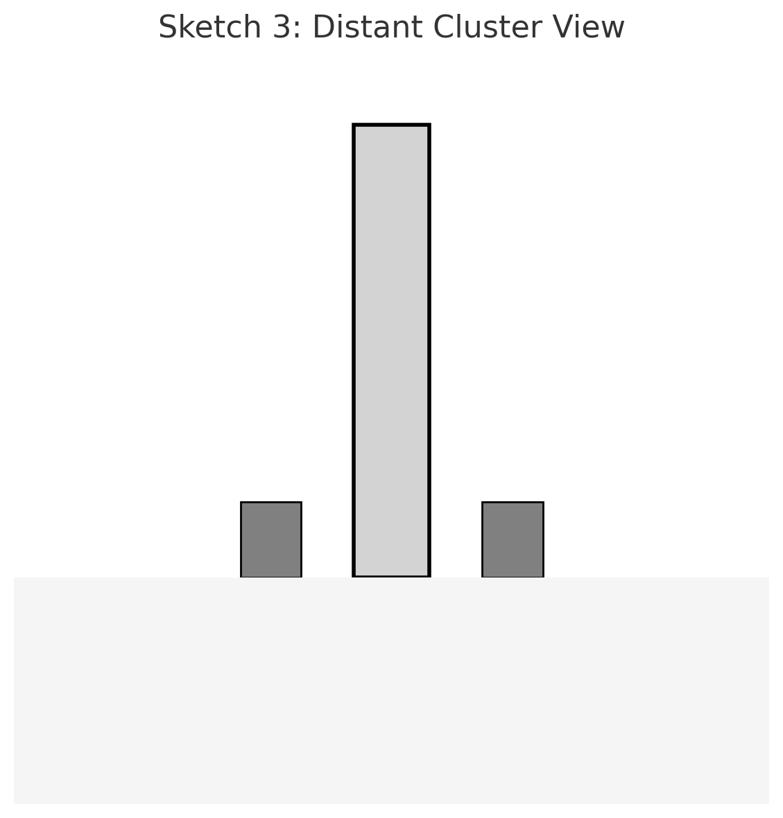 Main form: The dominant block and its smaller companions clearly define a central cluster.