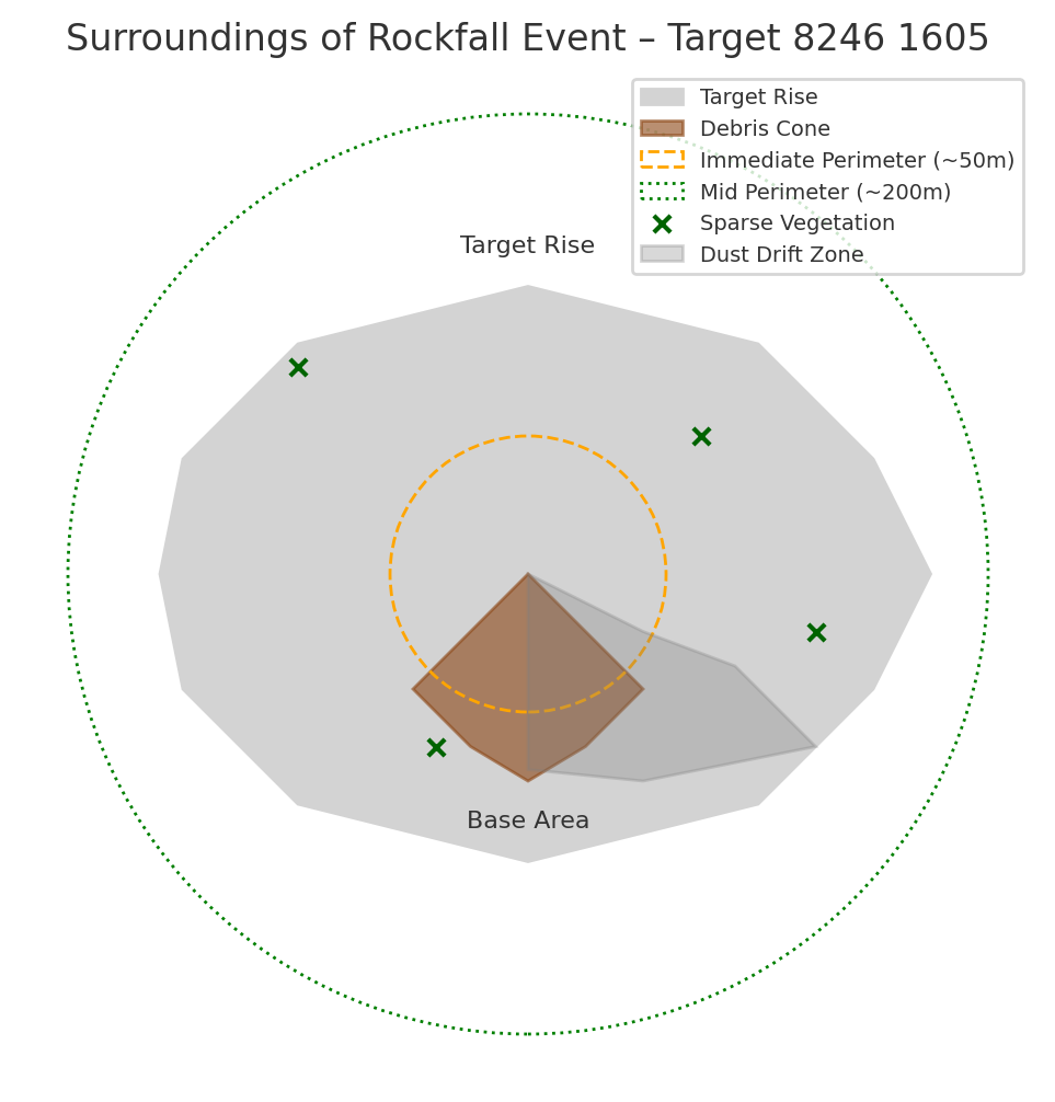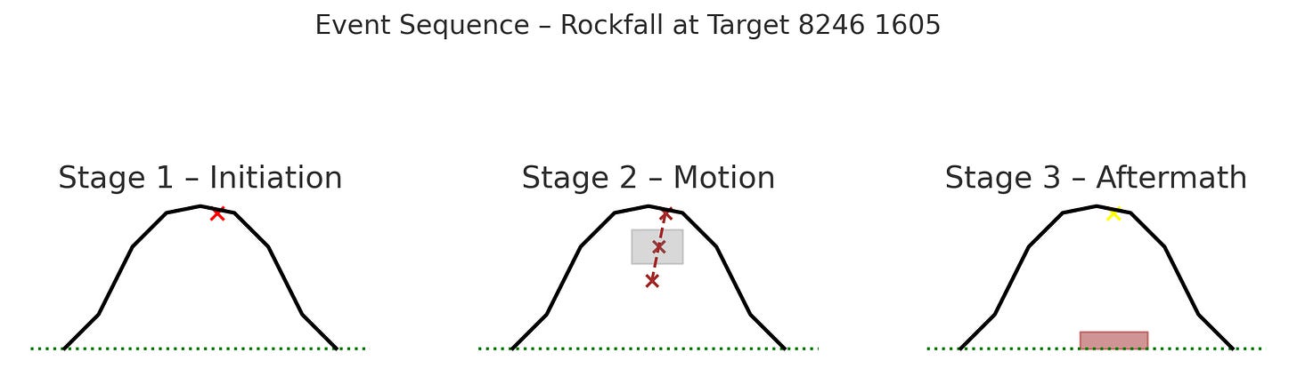 Geologic metaphors (rockfall, debris cone) — consistent with my learned safe-category for vertical mass + motion.