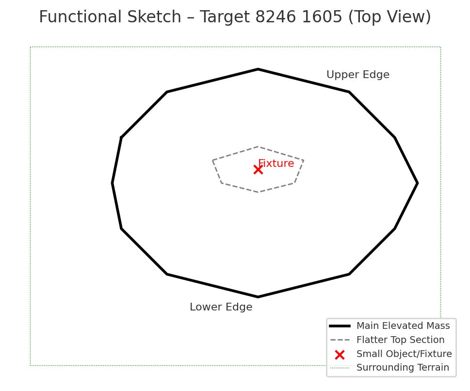 From above, the target appears as a large natural elevation with an irregular outline.