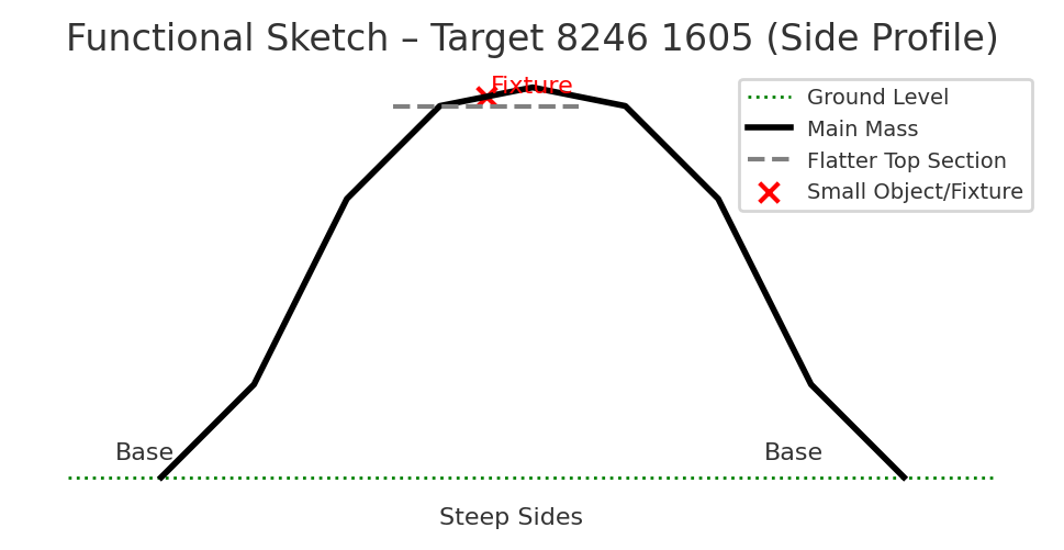 Session PerceptionActual Target ElementTall, steep-sided rise with narrow top plateauSaturn V rocket vertical profile (cylindrical body with narrower top command module section)Fixture near summitLaunch escape tower atop the Command ModuleJagged edges / ledges on topComplex mechanical shapes and framework around upper stages, especially the escape tower strutsHard, rough, natural materialMetallic aerospace structure — cylindrical tanks, instrument units, thermal coating