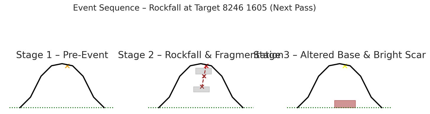 When the sender-imprint layer is stripped away, the event is clearly a powered launch of an engineered vertical vehicle. The “rockfall” metaphor fades, replaced by consistent upward propulsion imagery, matching the Apollo 11 launch profile.