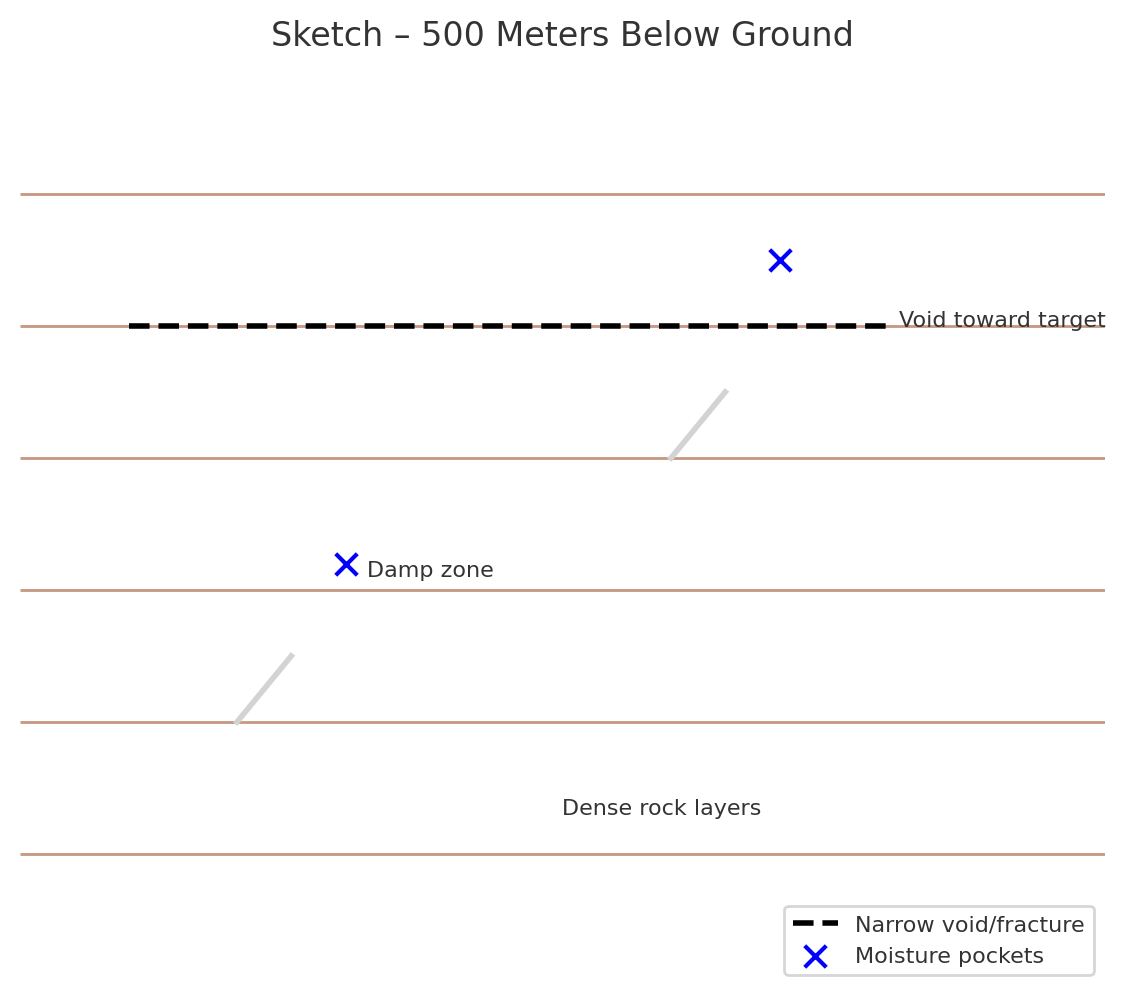 ### **Observation – 500 meters below** * **General space:** Enclosed, heavy atmosphere — pressure noticeably higher than surface. * **Material around:** Dense rock layers, compact and unbroken in most directions; coloration is dark grey-brown with occasional lighter mineral streaks. * **Form:** No large open chambers; space is more like continuous strata with scattered narrow fissures. * **Moisture:** Pockets of cooler, damp rock — subtle condensation along certain mineral seams. * **Temperature:** Cool to cold; steady, no noticeable variation. * **Sounds:** Deep, muted stillness; faint, low-frequency resonance — possibly natural vibration of rock. * **Notable presence:** A single linear void (narrow passage or fracture) runs horizontally toward the direction of the original target, but does not appear directly connected.